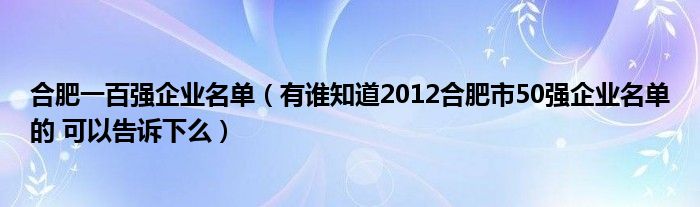 关于合肥一百强企业名单,有谁知道2012合肥市50强企业名单的 可以告诉下么这个很多人还不知道,今天菲菲来为大家解答以上的问题,现在让我们一起来看看吧!