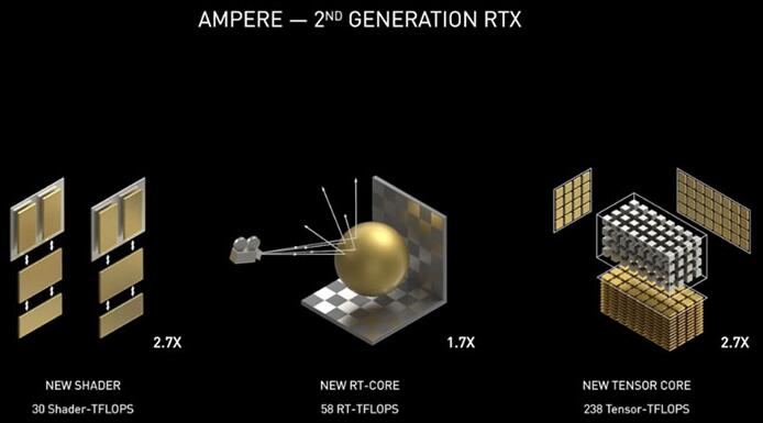 在演讲的一半左右,Huang终于了解了硬件。他首先透露了GeForce RTX 3080作为面向消费者的旗舰级新一代RTX Ampere GPU。除了相机,在展示了将RTX 30系列与较老的GeForce卡进行比较的各种性能幻灯片后,Huang 断言Pascal GPU(GTX 10系列)的所有者“现在可以安全升级”,他断言…单击下面的幻灯片进行检查淘汰了GeForce RTX的关键规格。