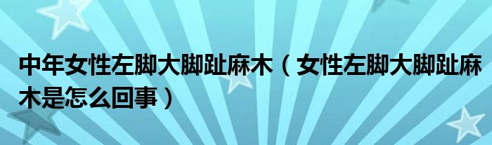 大家好,linda来为大家解答以上的问题。中年女性左脚大脚趾麻木,女性左脚大脚趾麻木是怎么回事很多人还不知道,现在让我们一起来看看吧!