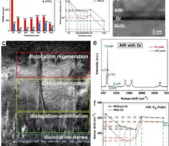 “具有石墨烯的AlN外延层的位错密度在QvdW外延过程中表现出异常的锯齿状演变,并且该值始终低于裸蓝宝石上的位错密度。最后,石墨烯使AlN薄膜的位错密度降低了62.6%.