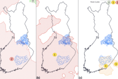 模型从三个主要风暴Tapani(a)、Rauli(b)和Pauliina风暴(c)预测的破坏示例。彩色区域显示模型预测的风暴及其颜色显示的预测破坏程度(红色=严重破坏,黄色=轻微破坏,绿色=无破坏)。反过来,这些数字描述了实际的危险等级。电网运营商的运营区域以蓝色显示。图片来源:芬兰气象研究所/CCBY4.0