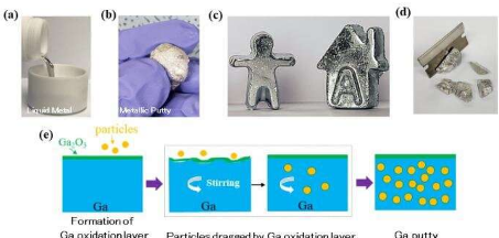 韩国蔚山市基础科学研究所(IBS)的多维碳材料中心(CMCM)和蔚山国立科学技术研究院(UNIST)的研究小组发明了一种将填料颗粒掺入液体中的新方法镓以形成液态金属的功能复合材料。填料的加入取决于添加的颗粒的量,将材料从液态转变成糊状或油灰状形式(具有类似于商品“橡皮泥”的稠度和“感觉”)。在使用氧化石墨烯(GO)作为填充材料的情况下,GO含量为1.6〜1.8%会形成糊状,而3.6%的腻子形成最佳。科学进展。