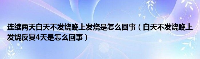 大家好,linda来为大家解答以上的问题。连续两天白天不发烧晚上发烧是怎么回事,白天不发烧晚上发烧反复4天是怎么回事很多人还不知道,现在让我们一起来看看吧!