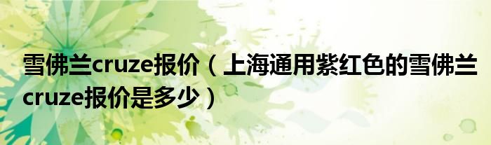 最佳答案大家好,小常来为大家解答以下问题,对于雪佛兰cruze报价,上海通用紫红色的雪佛兰cruze报价是多少很多人还不知道,今天让我们一起来看看吧!1,上海通用紫红色的雪佛兰cruze报价是多少:15万2,雪佛兰CRUZE多少钱一辆 :沈阳雪佛兰官方指导价:最低10.89万,最高为16.39万。近期临近年底,各个车...
