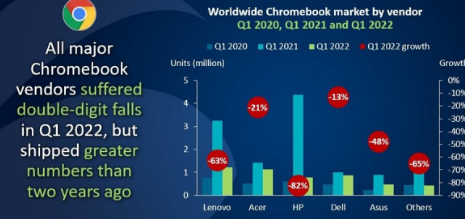 2022年第一季度,全球出货了490万台Chromebook。出货量的下降归因于消费者和教育购买Chromebook以支持在家上学的减少。Canalys指出,北美占全球Chromebook出货量的72%,而市场的Chromebook出货量下降了64%。